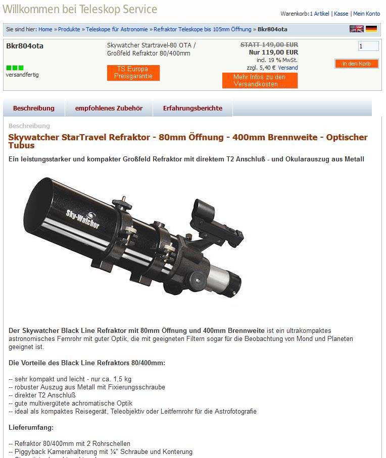 Die bekannten Astro-Shops bieten auch aktuelle Einsteiger Teleskope an, z.B. das SkyWatcher StarTravel