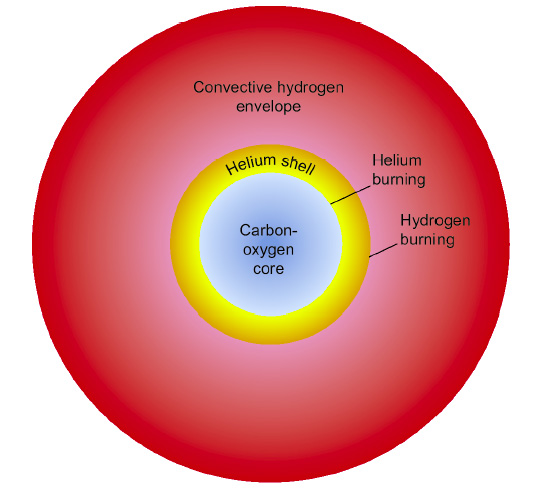 Wenn der Wasserstoff vollständig zu Helium fusioniert wurde, fällt diese Energiequelle weg. Der Stern kontrahiert etwas und die Temperatur im Inneren steigt an. Es kann zunächst zu einem sog. Schalenbrennen kommen, wo Wasserstoff in einer Schale zu Helium fusioniert wird. Durch das Schalenbrennen steigt der innere Strahlungsdruck wieder stark an und der Stern dehnt sich aus zum sog. “Riesen”.