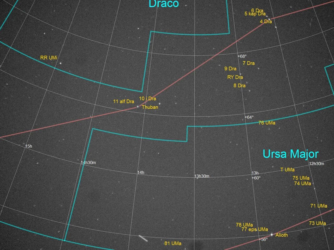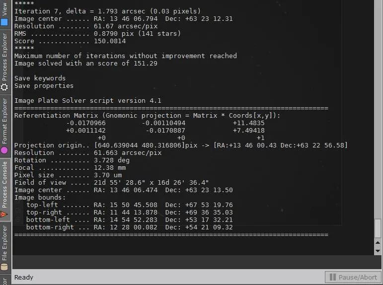 Ergebnis von PixInsight: RA:  13h 46m 06,474s   Dec: 63° 23′ 13,50″   Field of View: 21° 55′ x 16° 26′  Rotation:  3,728° Focal  12.38 mm