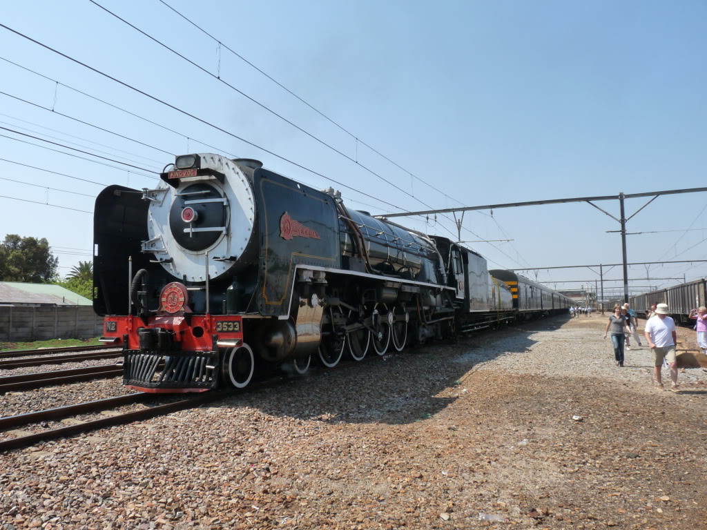 Heute ganz früh sind wir in Klerksdorp/Potchefstroom losgefahren und dann über Johannisburg zum kleinen Bahnhof “Centurion” (Pretoria), wo eine klassisch Dampflock vorgespannt wurde. Eines der Paradestücke von Rohan Voss. Es war die jüngste der Rovos-Dampflokomotiven – so von 1954. Dass haben wir natürlich fotografisch festgehalten.