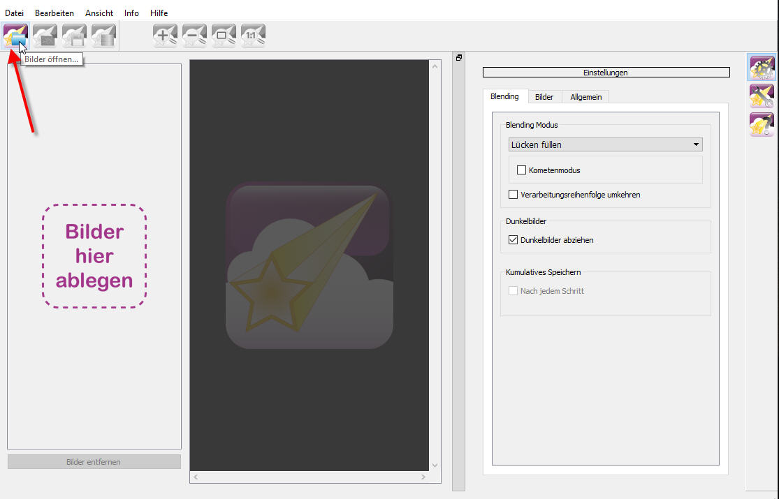 Abbildung 1: Einzelaufnahmen laden (pCloud: StarStax-01.jpg)