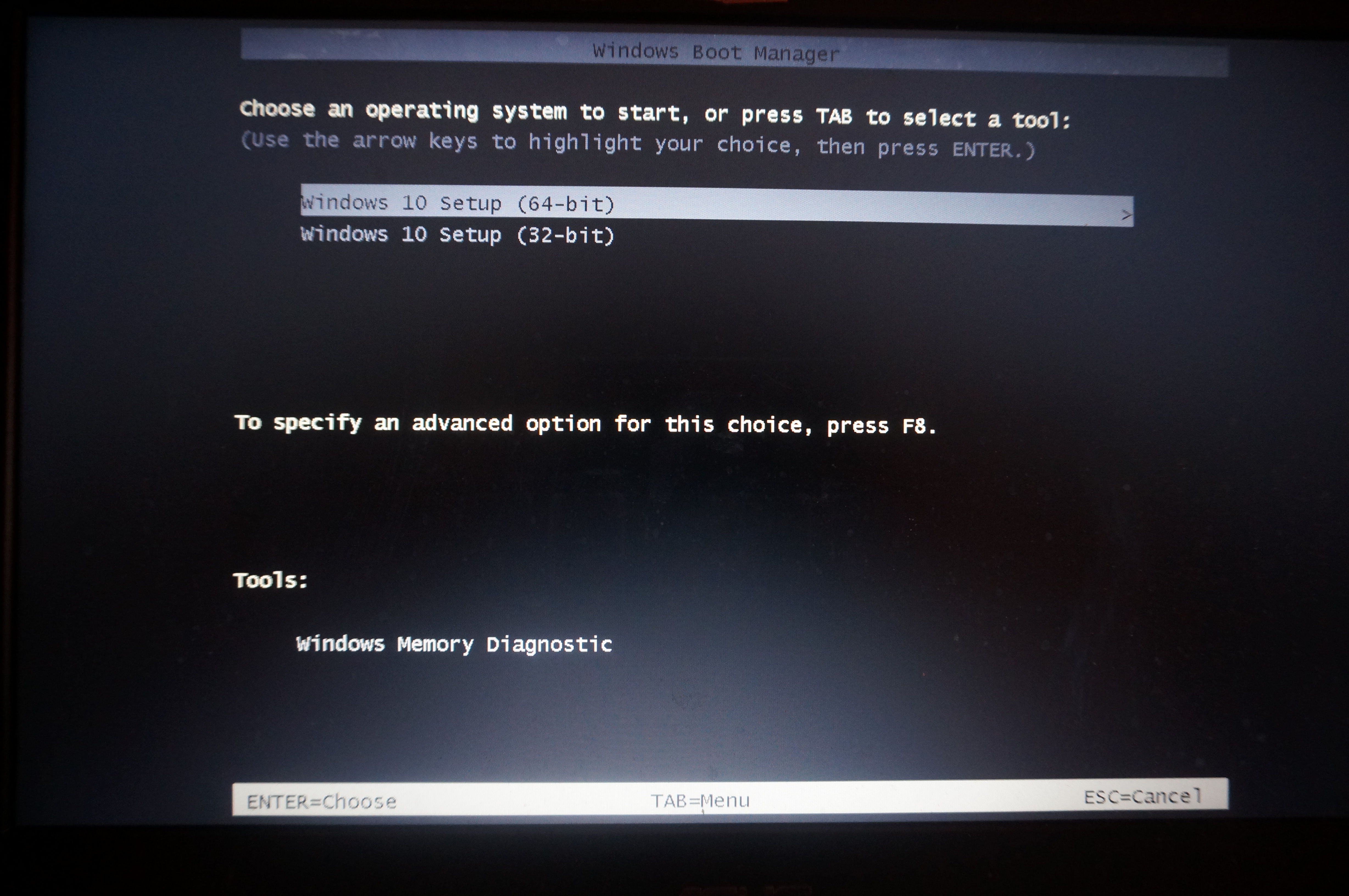Ich will ja nicht Windows installieren, sondern drücke “F8” um in die “Advanced Options” zu kommen. Dann erschein folgender Bildschirm: